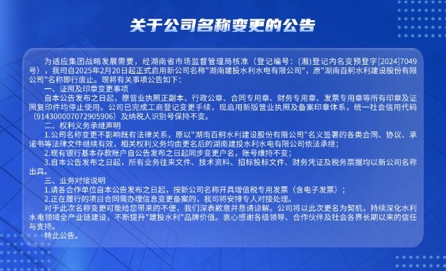 2022年9月,原湖南建工集團(tuán)與原湖南交水建集團(tuán)合并組建湖南建設(shè)投資集團(tuán)。原雙方集團(tuán)旗下的湖南百舸水利建設(shè)股份有限公司和湖南建工集團(tuán)水利水電工程公司合并為湖南建投百舸水利公司,實(shí)行兩塊牌子(百舸水利、建工水利)管理,為湖南建投集團(tuán)唯一水利建設(shè)企業(yè)。2024年9月,公司正式更名為湖南建投水利水電有限公司(簡(jiǎn)稱湖南建投水利),統(tǒng)籌管理“百舸水利”“建工水利”“施工公司”“疏浚公司”等子品牌。